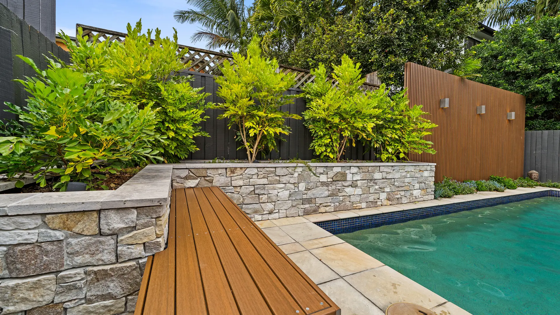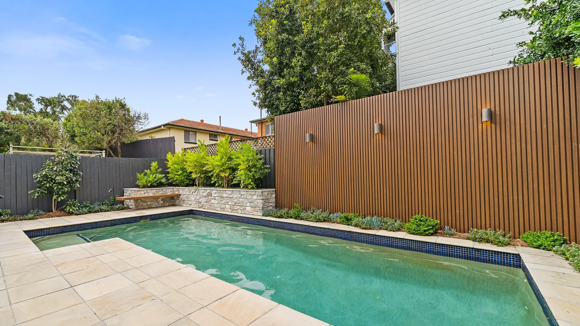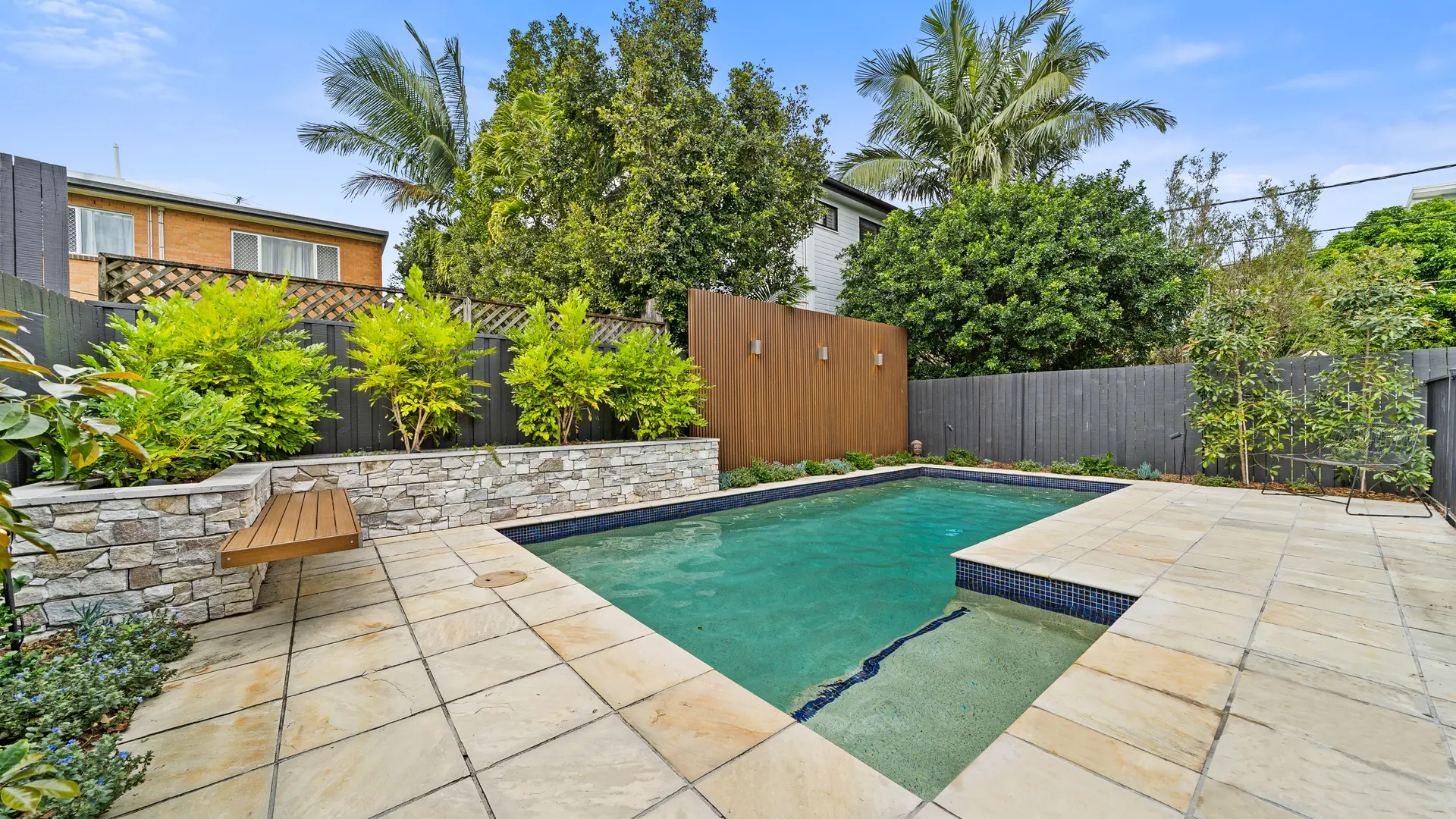 The poolside transformation seamlessly combines style and functionality, creating a modern, low-maintenance haven perfect for relaxation, entertainment, and embracing the Brisbane lifestyle. Among the key design features are a raised stone-clad garden bed, a floating timber bench, and an EKODECK batten screen. These thoughtful elements enhance both privacy and aesthetic charm.