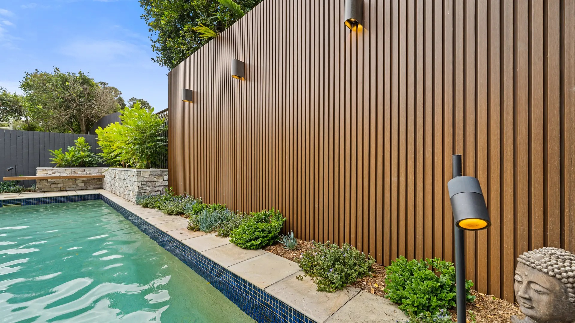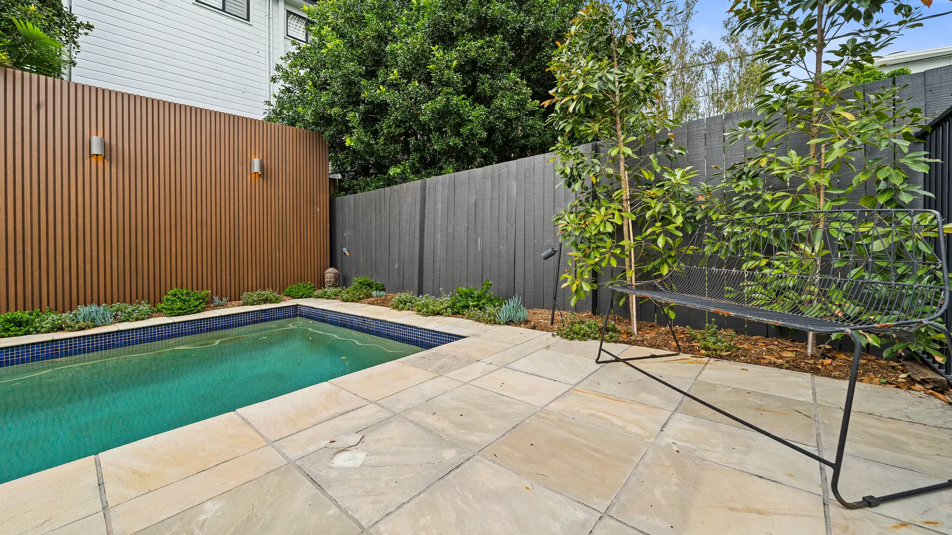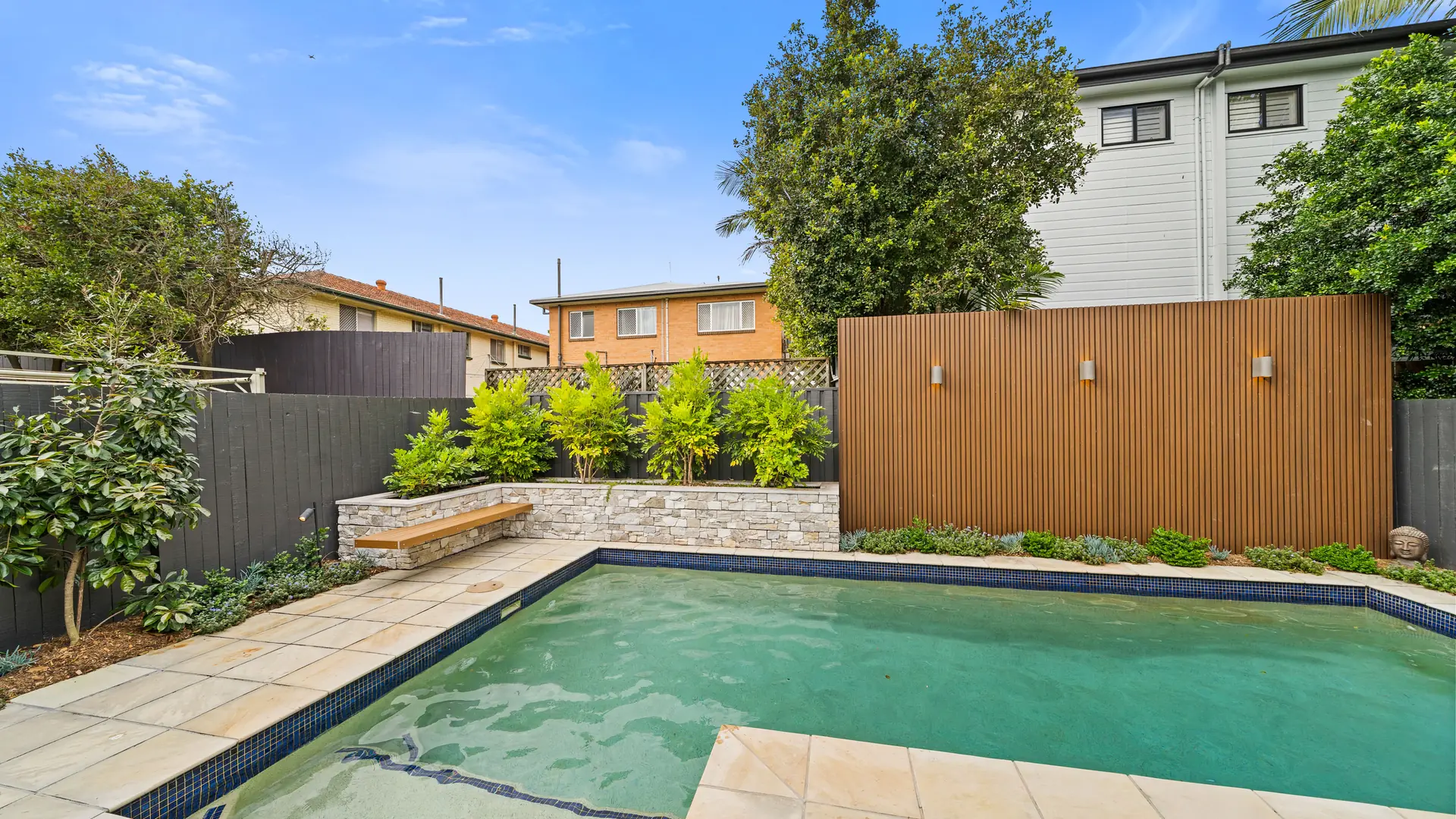 The poolside transformation seamlessly combines style and functionality, creating a modern, low-maintenance haven perfect for relaxation, entertainment, and embracing the Brisbane lifestyle. Among the key design features are a raised stone-clad garden bed, a floating timber bench, and an EKODECK batten screen. These thoughtful elements enhance both privacy and aesthetic charm.