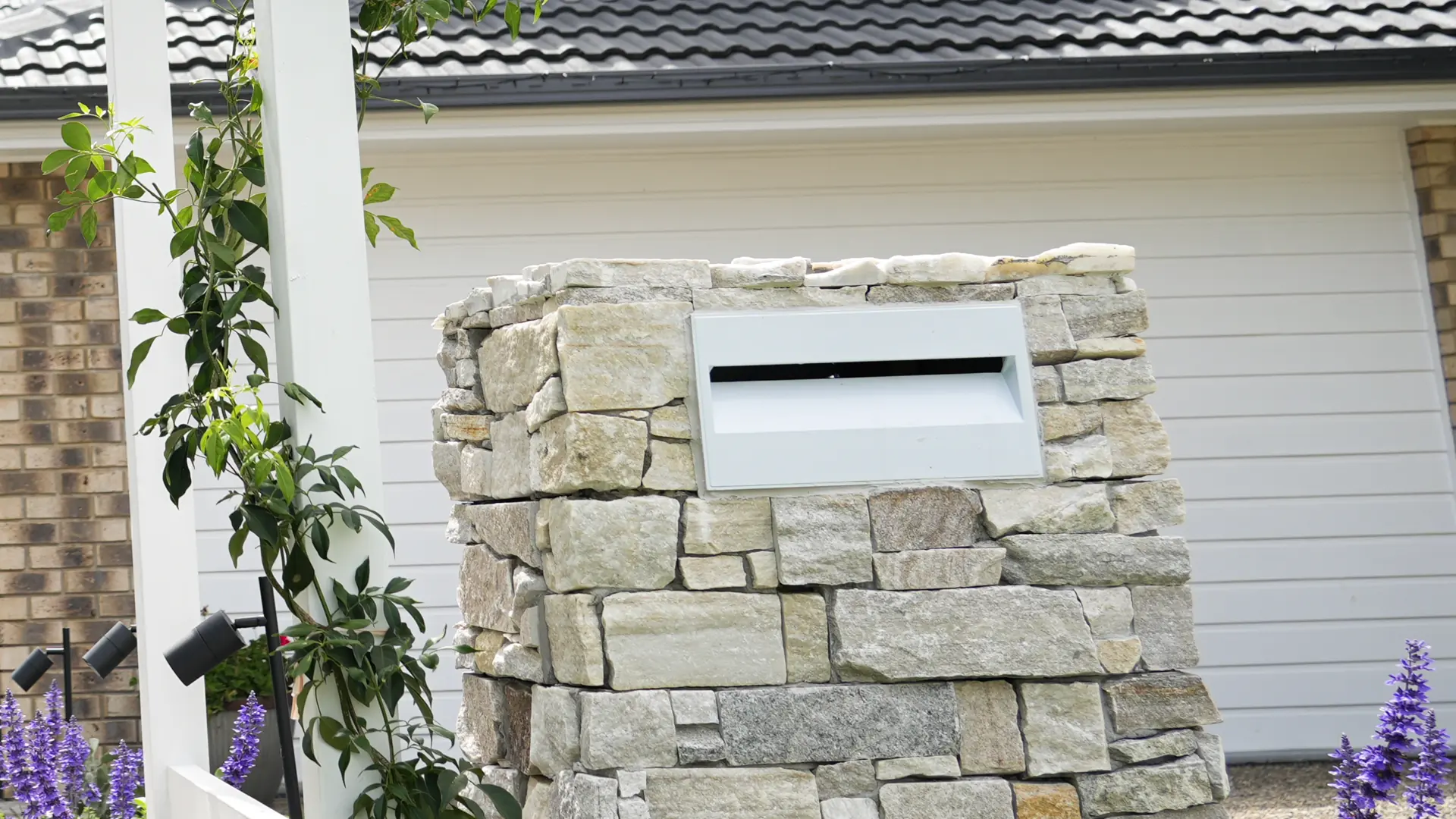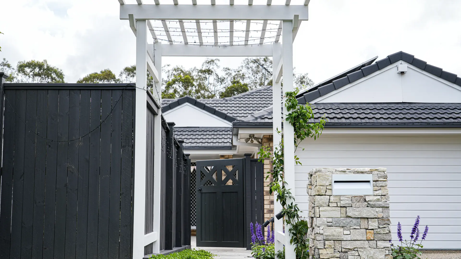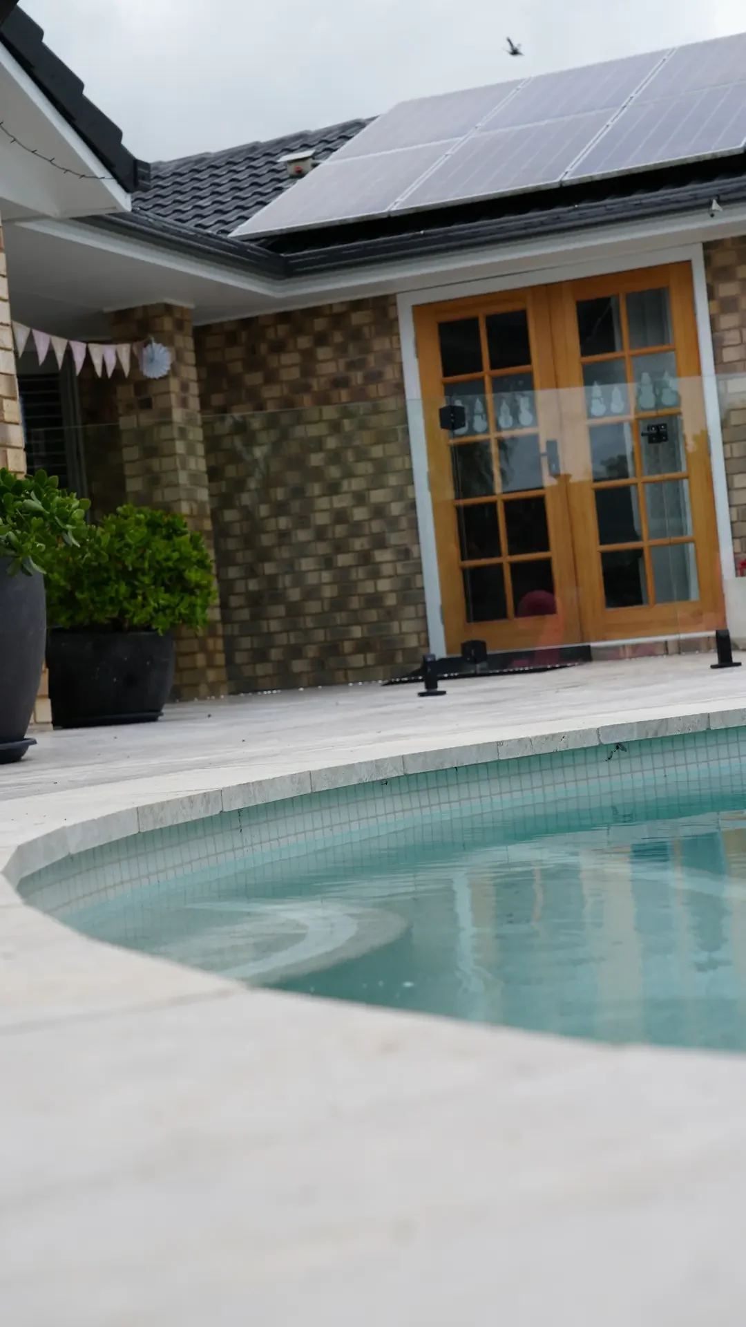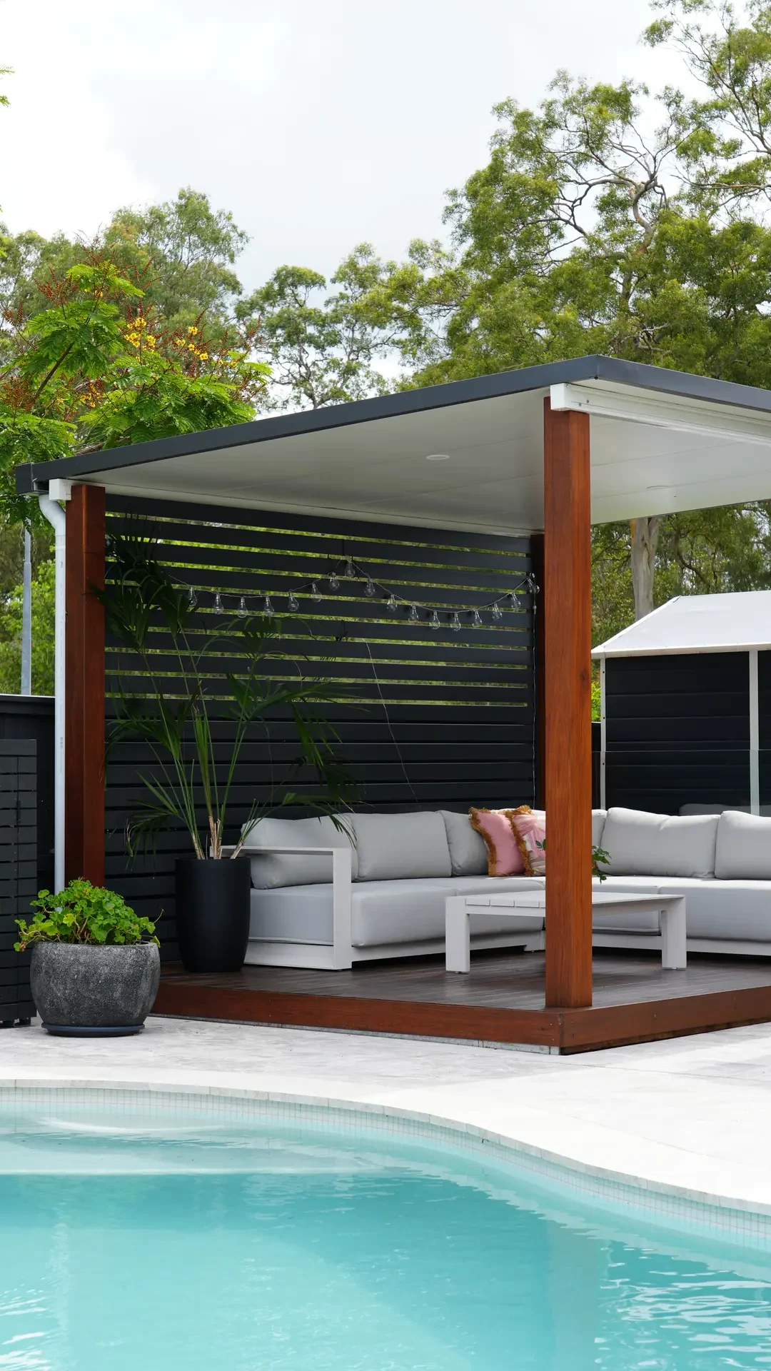 A custom timber arbor frames the entrance, while bespoke limestone steps provide wheelchair access, all harmonized with the home’s red brickwork. A custom pergola over a spotted gum deck offers a shaded, elevated area perfect for poolside relaxation.